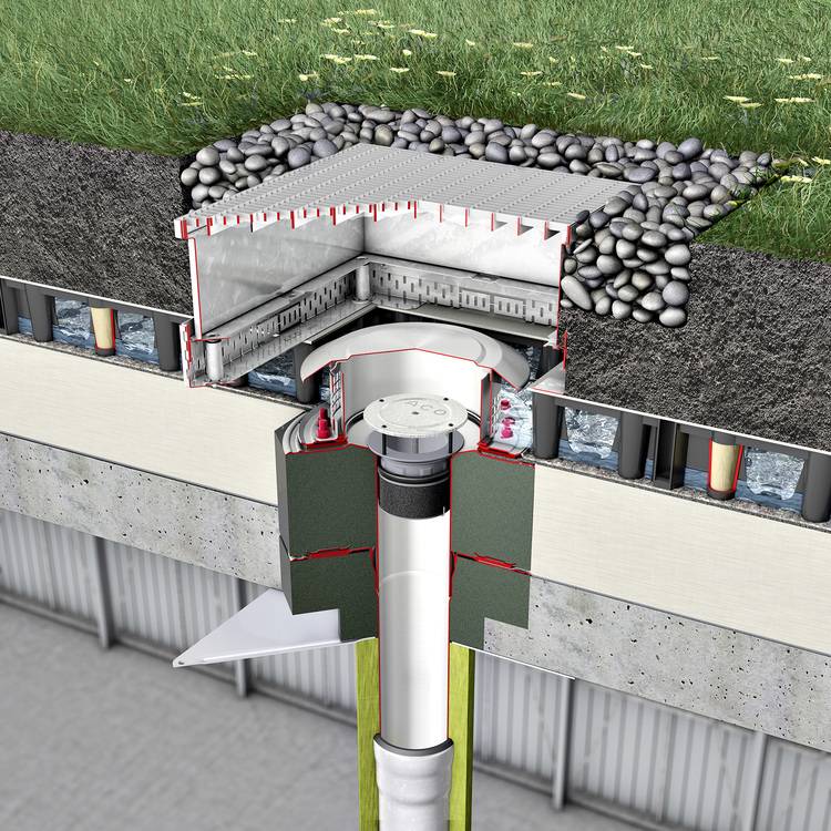 Die Begrünung hat direkten Einfluss auf die Dachentwässerung. Der Spitzenabflussbeiwert berücksichtigt den Dachaufbau eines extensiv oder intensiv begrünten Daches. Die Drainageschicht sorgt für einen einwandfreien Abfluss des Regenwassers zu den Abläufen.
