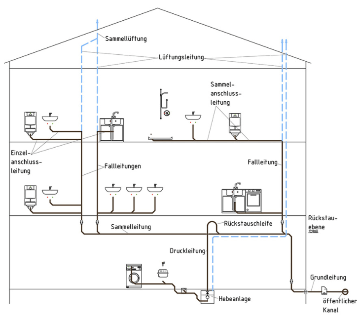Als Einzelanschlussleitung gelten Leitungen vom Geruchverschluss eines Entwässerungsgegenstandes bis zur Einmündung in eine weiterführende Leitung. Und Sammelanschlussleitungen vereinen mehrere Einzelanschlussleitungen bis zur Fall-, Sammel- oder Grundleitung. Durch das Bad im obersten Geschoss eines Hauses führt dann noch regelmäßig die Lüftungsleitung über Dach. Andere Leitungsabschnitte lassen sich sehr gut anhand der Zeichnung in Bild 1 erkennen und korrekt benennen.