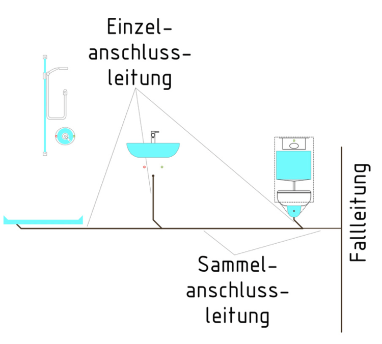 Sind mehrere Entwässerungsgegenstände innerhalb eines Bades zusammengeführt und münden dann gemeinsam in eine Fallleitung, handelt es sich um eine Sammelanschlussleitung. Werden beispielsweise die Abwässer eines Bidets und eines Waschbeckens zusammen abgeführt, muss die Dimension für diese Leitung bestimmt werden. Jedes dieser Sanitärobjekte hat einen speziellen Anschlusswert, abgekürzt DU, welcher die anfallende Abwassermenge in Liter pro Sekunde beschreibt. Die DU-Werte sind ebenfalls in der Tabelle 1 in der Spalte für Anschlusswerte gelistet. Beispielsweise wird dort für ein Waschbecken ein DU-Wert von 0,5 l/s angegeben.