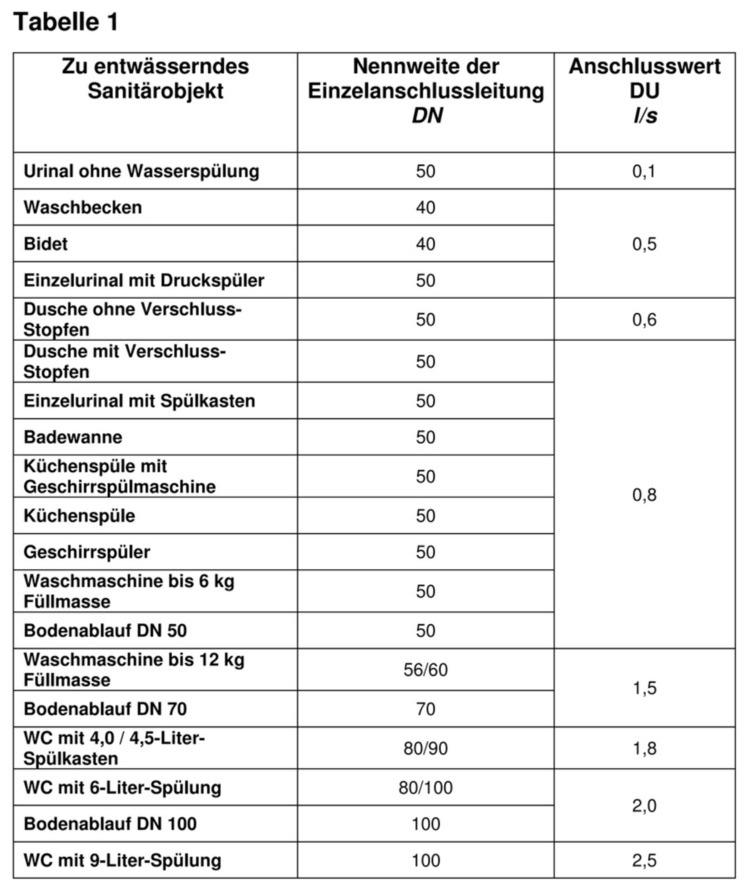 Die DIN 1986-100 führt auf, welchen Entwässerungsgegenständen verbindlich entsprechende Rohrleitungsquerschnitte zugeordnet werden. Diese werden in der Tabelle 1 auf dieser Seite des Berichts aufgeführt.