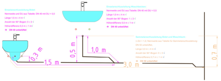 Ein weiteres Problem kann sich bei der Einhaltung der Maximallänge ergeben. Bis zu vier Meter kann man die Leitung verziehen. Darüber hinaus gibt es als Möglichkeit für eine Verlängerung des Leitungsverlaufs nur die Alternative der Belüftung dieser Einzelanschlussleitung. Dann dürfen es auch bis zu 10 Meter Gesamtlänge sein. Anstatt einer Belüftung eine Vergrößerung des Rohrquerschnittes vorzunehmen, ist nicht zielführend. Größere Querschnitte bei geringen Abwassermengen führen, wie bereits eingangs beschrieben, zu sehr geringen Fließgeschwindigkeiten und bergen daher die Gefahr der Bildung von Ablagerungen mit potenzieller Verstopfung. Also wenn Distanzen von mehr als vier Metern zu überbrücken sind, gilt es, eine Einzelanschlussleitung zu belüften.