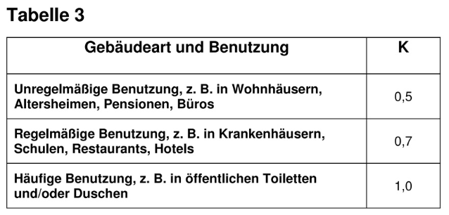 Da in der Regel mehrere Entwässerungsgegenstände nicht gleichzeitig genutzt werden, wird ein Gleichzeitigkeitsfaktor mit dem Kürzel -K- für die anzunehmende Entwässerungsleistung angenommen. Diese sogenannten Abflusskennzahlen werden in Tabelle 3 dargestellt.