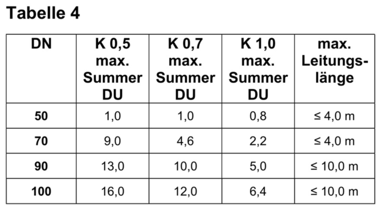 Die Vorgehensweise zur Bestimmung des notwendigen Rohrquerschnitts ist dann recht einfach. Man bestimmt die Summe und liest aus der entsprechenden Tabelle die notwendige Dimension ab. Eine solche Liste finden Sie hier als Tabelle 4 für unbelüftete Sammelanschlussleitungen. Auch hierbei gilt es letztlich wiederum, die Grenzwerte für diesen Leitungstyp nicht zu überschreiten.