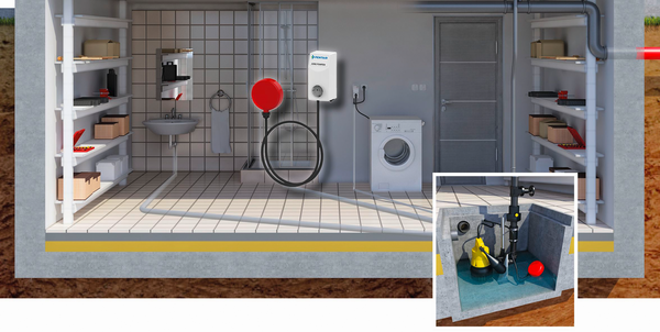 Alternativ zu einem Unterflurbehälter ist auch die Rückstausicherung mittels Überflurbehälter denkbar: Diese kompakten Behälter zur Grauwasserentsorgung werden in vielen Fällen direkt unter dem Waschbecken angeordnet. Vor allem beim Anschluss von Waschmaschinen empfiehlt sich der Einbau einer Alarmanlage, da die Wassermenge eines Waschvorgangs meist mehr als die doppelte Wassermenge des Behältervolumens beträgt (Bild 3). Alarmanlagen mit eingebautem Waschmaschinenstopp verhindern, dass bei Störungen an der Pumpe nachlaufendes Wasser aus der Waschmaschine zu einer Überflutung von Kellerräumen führt.