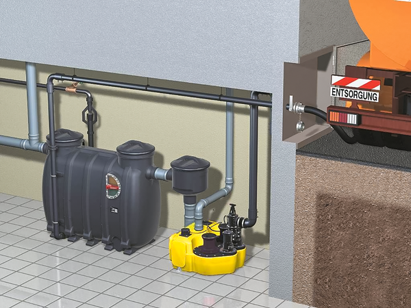 Fakt ist, die Installation von Hebeanlagen in Kombination mit Fettabscheidern oder in Hochhäusern oder Tiefgaragen sollte generell mit einer Doppelpumpenanlage erfolgen (Bild 6). Die Folgen eines Ausfalls könnten sonst erhebliche Ausmaße haben. So müsste ein Restaurant, dessen Hebeanlage oftmals Küchen und Toiletten abwassertechnisch entsorgt, seinen Betrieb einstellen, solange ein Pumpenausfall nicht behoben ist. Erhebliche hygienische Probleme oder sogar die Gefährdung wirtschaftlicher Wertgegenstände könnten die Folge eines solchen Ereignisses sein.