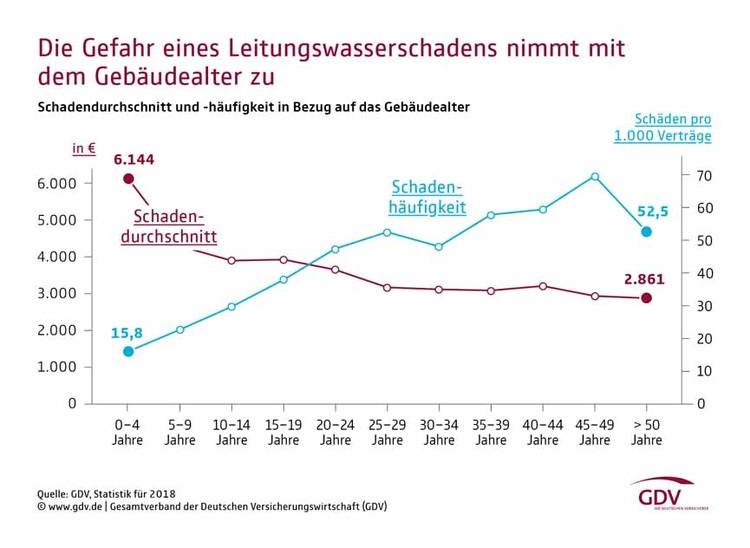 Im Jahr 2019 zählten die Wohngebäudeversicherer deutschlandweit rund 1,1 Millionen Leitungswasserschäden. Die Kosten summierten sich auf 3,1 Milliarden Euro. Der Schadendurchschnitt erhöhte sich um knapp sieben Prozent auf 2.881 Euro. Hinzu kommen 280 Millionen Euro Schäden in der Hausratversicherung.