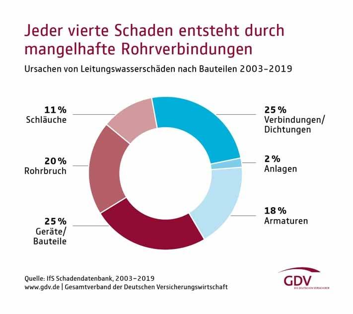 Von 2002 bis 2019 leisteten die Gebäudeversicherer für alle versicherten Gefahren (Sturm/Hagel, Feuer, Leitungswasser und weitere Naturgefahren) insgesamt 77 Milliarden Euro. 38 Milliarden Euro – also fast die Hälfte der Leistungen – entfielen auf Leitungswasserschäden.