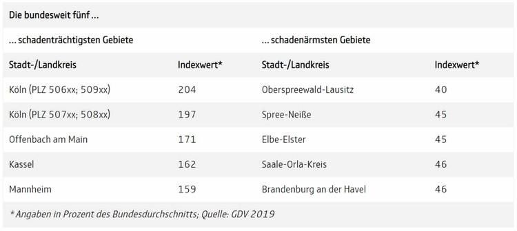 Der Indexwert für Leitungswasserschäden war in der Kölner Innen- und Südstadt mit 204 mehr als doppelt so hoch wie im Bundesdurchschnitt (100). Das geht aus Zahlen des Gesamtverbandes der Deutschen Versicherungswirtschaft (GDV) hervor.