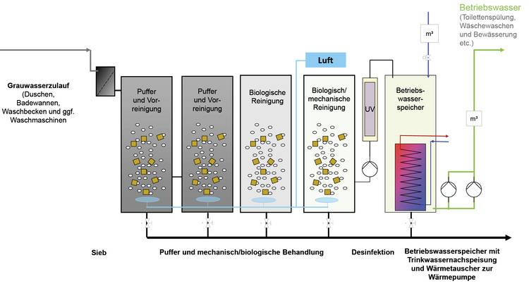 Grauwassernutzungsanlagen bestehen in der Regel aus folgenden funktionalen Elementen: