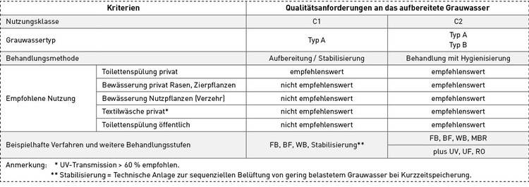 Auszug aus Tabelle 4 „Qualitätsanforderungen für aufbereitetes Grauwasser sowie Behandlungsverfahren“ aus Merkblatt DWA-M 277.