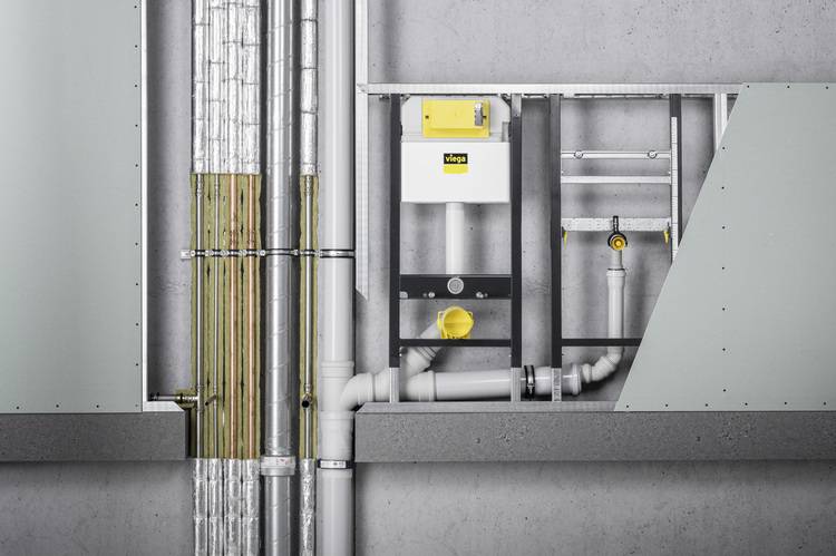 Je nach Leitungsart kommen in einem Schacht verschiedene Brandschutzprodukte und -systeme zum Einsatz, für die obendrein unterschiedliche Anwendbarkeitsnachweise zu beachten sind. Für Trinkwasser- und Heizungsleitungen von Viega ist Mineralwolle als Abschottung zugelassen. Abflussleitungen aus Kunststoff oder Guss müssen jedoch mit einer Brandschutzmanschette abgeschottet werden. Für Entwässerungssysteme, bei denen die Fallrohre aus Guss und die angeschlossenen Sammelleitungen aus Kunststoff gefertigt sind, gelten zum Teil zusätzliche Vorgaben. Denn hierbei handelt es sich ebenfalls um eine Mischinstallation. Zudem werden in der Entwässerung die Rohre nicht dauerhaft mit dem Medium durchflossen und sind an den Enden offen. Abluftleitungen aus Bädern und WCs sind wiederum mit Absperrvorrichtungen gegen die Ausbreitung von Rauch zu schützen.