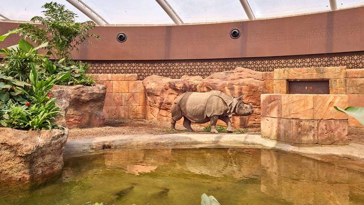 Panzernashörner erhielten hier ein weitgehend artgerechtes, ihrem natürlichen Lebensraum an indischen Flussufern nachempfundenes Zuhause. Auf rund 14.000 qm wurde ein naturnahes Sumpfgebiet gestaltet, inklusive einer 5.000 qm großen Wellnesslandschaft.