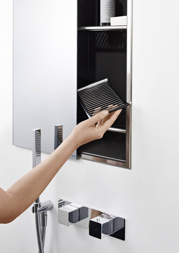 Im Duschbereich lassen sich Ablagemöglichkeiten ebenfalls in die Vorwand integrieren. Hier schaffen Nischenablagen Stauraum, ohne den Bewegungsraum in der Dusche einzuschränken. Vorteilhaft sind Boxen, die auf das Vorwand-Installationselement abgestimmt und für die Einbindung in die Abdichtebene der Duschwand vorbereitet sind. Wichtig ist, dass der Innenraum der Box Wasser nach vorn ableitet, um die Bildung von Wasserrückständen im Innern zu verhindern. Besonders aufgeräumt wirken die Ablagen, wenn sie sich wandseitig mit einer Spiegeltür verschließen lassen.