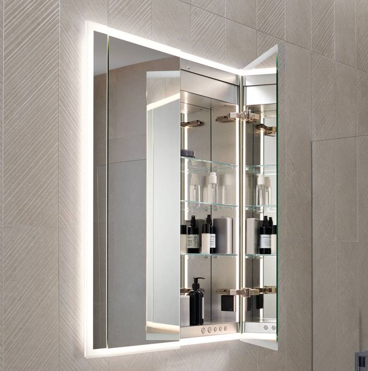Mehr Freiraum und Platz über dem Waschtisch ermöglicht ein in der Vorwand integrierter Spiegelschrank. Spiegeltüren und integrierte Beleuchtungen schließen nach Art eines Lichtspiegels nahezu bündig mit der Wand ab. Dahinter können großzügige Ablagen für Kosmetikartikel und Steckdosen für Föhn oder Rasierer dezent verborgen untergebracht werden.