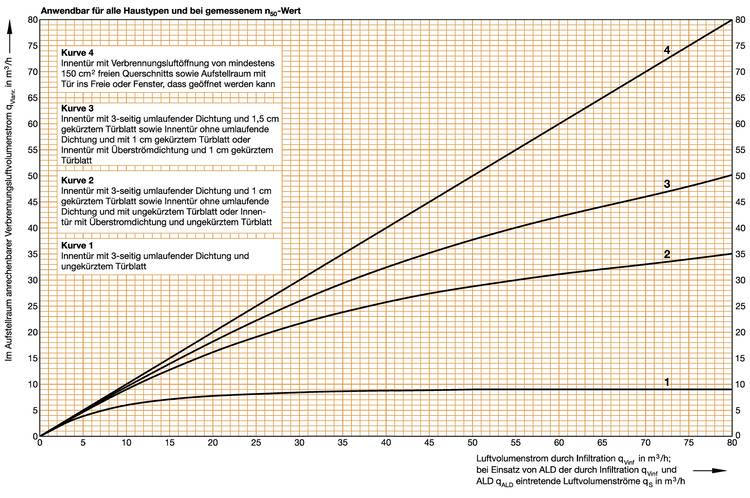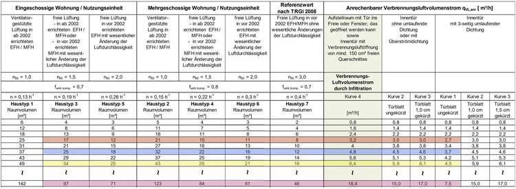 Dies bedeutet, der anrechenbare Verbrennungsluftvolumenstrom muss größer oder gleich dem Verbrennungsluftbedarf sein. Der anrechenbare Verbrennungsluftvolumenstrom ist der Luftvolumenstrom, der in den Aufstellraum strömt.