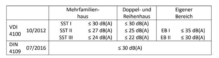 Darüber hinaus können nach der VDI-Richtlinie 4100 weitere Schallschutzstufen vereinbart werden. Wird im Werkvertrag ein erhöhter Schallschutz für das Gebäude vereinbart, greift mit dem Beiblatt 2 zur DIN 4109 eine Regel, die den Schalldruckpegel auf maximal 25 dB(A) begrenzt.