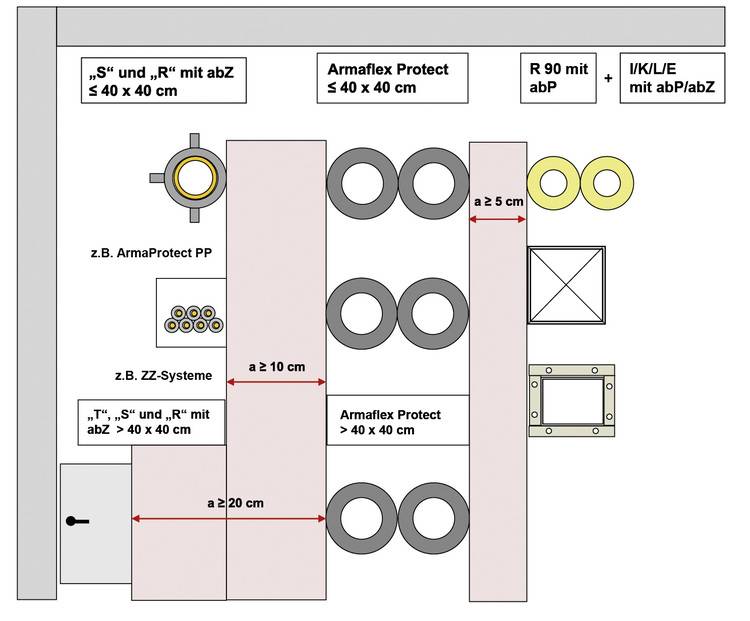 Grundsätzliche Angaben zu Abständen von Rohrabschottungen findet man in der Muster-Leitungsanlagen-Richtlinie (MLAR [4]). Dort heißt es unter Abschnitt 4.1.3: „Der Mindestabstand zwischen Abschottungen, Installationsschächten oder -kanälen sowie der erforderliche Abstand zu anderen Durchführungen (z. B. Lüftungsleitungen) oder anderen Öffnungsverschlüssen (z. B. Feuerschutztüren) ergibt sich aus den Bestimmungen der jeweiligen Verwendbarkeits- oder Anwendbarkeitsnachweise; fehlen entsprechende Festlegungen, ist ein Abstand von mindestens 50mm erforderlich.“ Verwendbarkeits- oder Anwendbarkeitsnachweise sind abP, abZ, ETA oder ZiE (Zustimmung im Einzelfall).