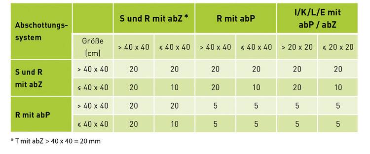 Für Kabel- und Rohrabschottungen mit allgemeinen bauaufsichtlichen Zulassungen (abZ) hat das Deutsche Institut für Bautechnik (DIBt [5]) die Mindestabstände allerdings neu festgelegt. In den betroffenen Zulassungen findet man daher jetzt folgende Angaben: Der Abstand der zu verschließenden Bauteilöffnungen (Anmerkung: Maß der fertig erstellten Abschottung, nicht das Rohbaumaß!) zu anderen Öffnungen oder Einbauten muss mindestens 20cm betragen. Abweichend davon darf der Abstand bis auf 10 cm reduziert werden, sofern die zu verschließende Bauteilöffnung oder Einbauten nicht größer als 20 x 20 cm sind.