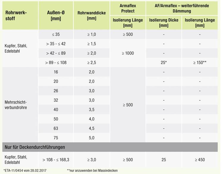 Die Einsatzmöglichkeiten von „normalen“ elastomeren Dämmstoffen als Rohrabschottung sind jedoch limitiert. Insbesondere bei der Verwendung auf Kupferrohrleitungen führt die gute Wärmeleitfähigkeit von Kupfer schnell zu einer unzulässigen Temperaturerhöhung auf der brandabgewandten Seite, sodass nur relativ kleine Rohrdurchmesser sicher brandschutztechnisch abgeschottet werden können. Das gilt insbesondere unter den europäischen Prüfbedingungen bei einem Ofendruck von 20 Pascal. Auch die Durchführung von Rohrleitungen durch Leichtbauwände ist allein mit elastomeren Dämmstoffen in der Regel nicht erfolgversprechend. Ebenso wenig wie die Abschottung von Kunststoffleitungen.