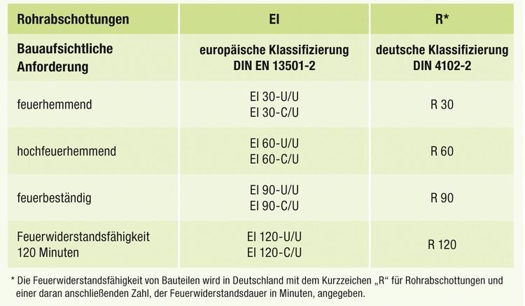 Der Feuerwiderstand von Rohrabschottungen wird nach DIN EN 1366-3 [6] geprüft und nach EN 13501-2 [2] bzw. in Deutschland nach DIN 4102-11[3] klassifiziert. Kriterien zur Beschreibung des Feuerwiderstandes sind: R (Tragfähigkeit), E (Raumabschluss) und I (Wärmedämmung). Bei den Prüfungen für Rohrabschottungen wird zudem noch angegeben, ob die Rohrenden während der Prüfung offen oder geschlossen (uncapped/capped) sind.