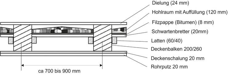 Die brandschutztechnische Wirkungsweise einer Holzbalkendecke ist dadurch gegeben, dass die brennbaren Bestandteile der Decke (der statische Teil) gegen die Einwirkung eines Feuers durch eine äußere Hülle (Feuerwiderstand) geschützt (gekapselt) werden. Der Brandschutz bei der in Bild 2 gezeigten Bestandsdecke wird zum Beispiel von unten weitgehend durch den Rohrputz (Unterseite) und von oben durch die Dielung (Oberseite) bestimmt.