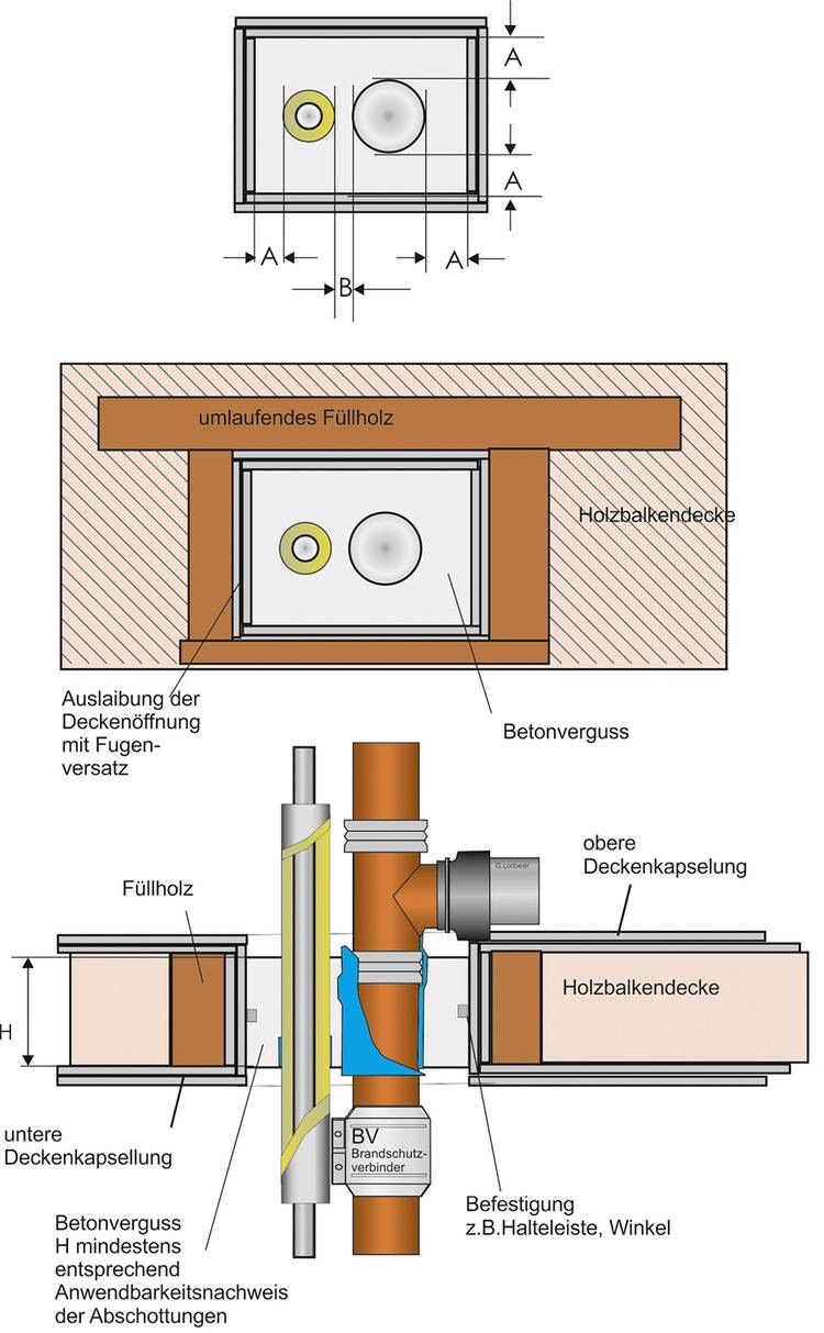 Diese Darstellungen sind meist nicht geprüft (gutachterlich bewertet) und entsprechen einer F30-Rohrabschottung mit Betonverguss in einer Deckenöffnung nach Musterholzbaurichtlinie. Die diskutierten 50 mm für das Abstandsmaß A können für Feuerwiderstände bis 30 Minuten als ausreichend betrachtet werden, jedoch auch nur bei einer Kapselung entsprechend Bild 4. Dabei sind die Befestigungsregeln (Randabstände für Befestigungen) für die Abschottungsmaßnahmen zu beachten.