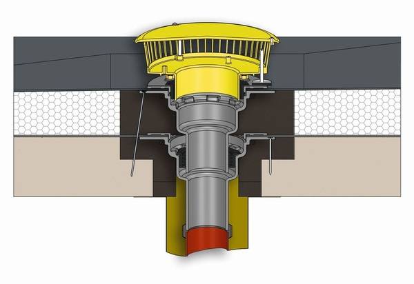 Bei einer einkalkulierten Brandbeanspruchung von oben und unten könnte zum Beispiel ein nicht brennbarer Gully mit nicht brennbaren Rohren und Formteilen, Brandschutzklasse A1, verbaut und so eine Installation aus nicht brennbaren Materialien realisiert werden. Gemäß einem Gutachten, das auch bei Sita angefordert werden kann, gestaltet sich ein F90-Aufbau in einem ganz normalen Beton-Warmdach wie folgt: Der SitaMulti Gully wird mit Schaumglaskörper in die Betondecke eingebaut. Angeschlossen wird ein nicht brennbares Rohr, das mit einer Dämmung ummantelt wird, die im Brandfalle auch vor der Weiterleitung von Hitze schützt und ansonsten den möglichen Kondenswasseranfall verhindert.