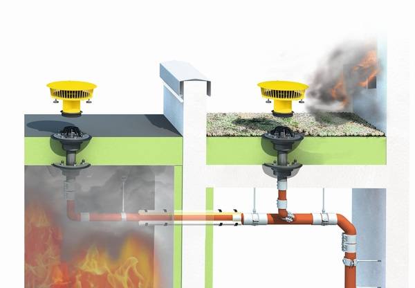Bei großflächigen Hallen und Industriebauten ist er zum Beispiel durch die DIN 18234, Teil 1 bis 4, geregelt, bzw. vorgeschrieben. Zur Erfüllung dieses Regelwerkes können beispielsweise der SitaFiresafe oder alternativ der SitaMulti eingesetzt werden. Bei Anforderungen nach der Feuerwiderstandsklasse F90 wird der SitaMulti aus Grauguss in Verbindung mit nicht brennbaren Rohren eingebaut. Die F90-Klassifizierung wurde zusätzlich von einem externen Gutachter geprüft.