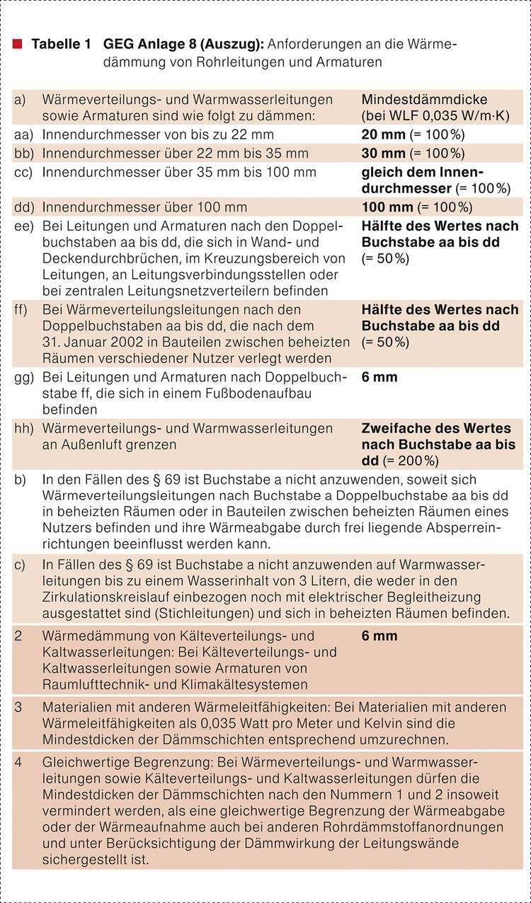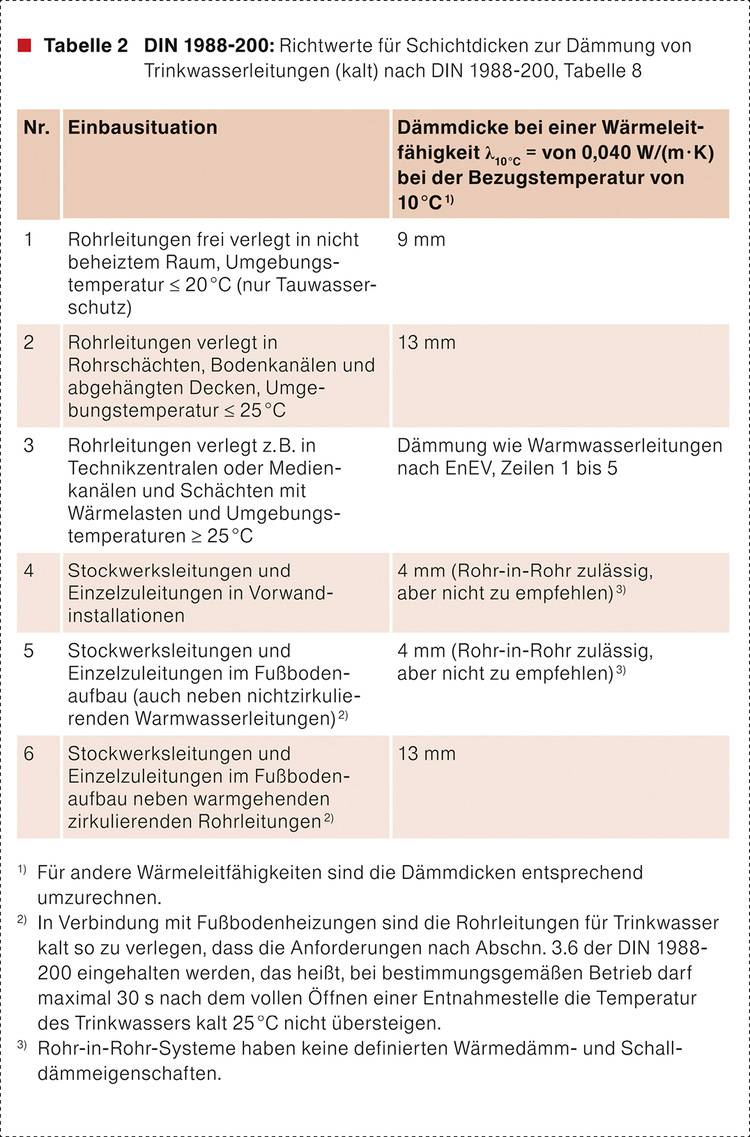 Und wenn die DIN 1988 für eine Kaltwasserleitung eine Dämmschichtdicke von 9 mm vorschreibt, gilt dies bei einer Wärmeleitfähigkeit von 0,040 W/(m•K).