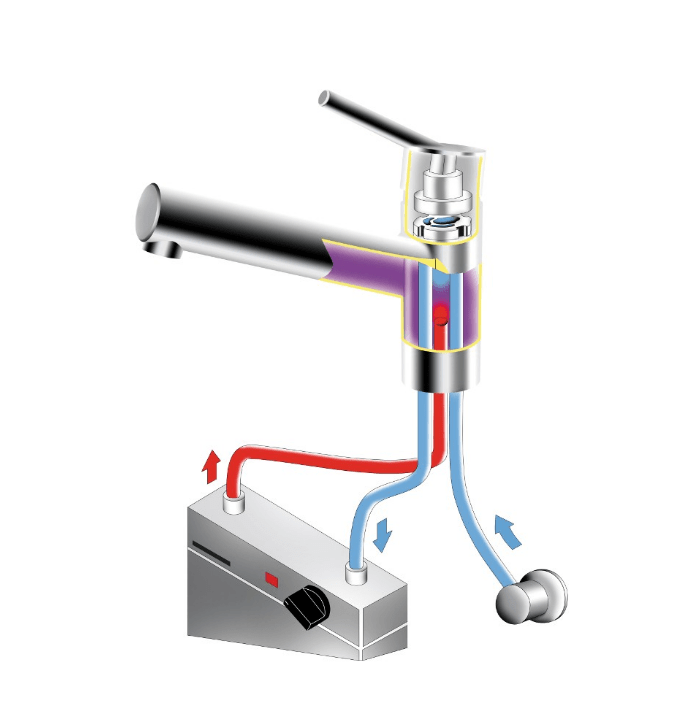 Die Niederdruckarmatur reduziert zudem den vollen Wasserleitungsdruck, weshalb der die ausströmende Warmwassermenge auch geringer ausfällt, als bei druckfesten Speichern in Verbindung mit Standard-Armaturen.