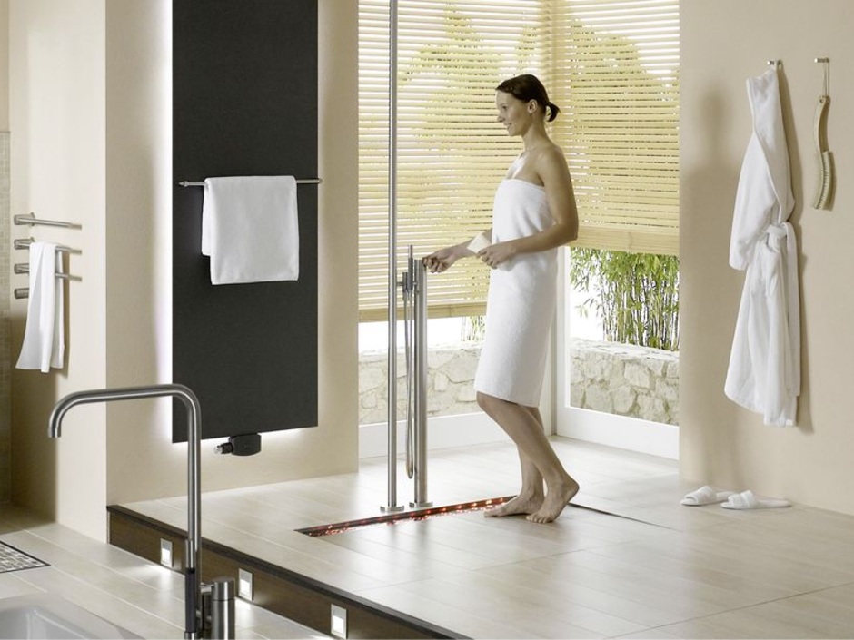 Eine Duschrinne fügt sich optisch unauffällig in das Fugenbild ein. Gegenüber herkömmlichen Duschwannen zeichnen sich Duschrinnen zusätzlich durch bodengleichen, schwellenlosen Einbau, durchgängige Befliesung der Duschfläche, gestalterische Vielfalt und Flexibilität bei der Planung aus.