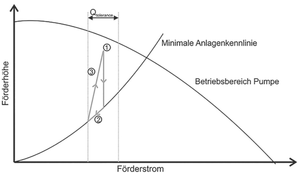 Der Algorithmus startet in Punkt 1. Solange der Durchfluss innerhalb der Grenzen Qtolerance bleibt, werden die Drehzahl und dadurch auch die Förderhöhe reduziert. Da gleichzeitig die Thermostatventile öffnen, bleibt der Förderstrom konstant, bis die Thermostatventile vollständig geöffnet sind. Ein weiteres Absenken der Drehzahl (und dadurch der Förderhöhe) kann jetzt nicht mehr durch die Thermostatventile ausgeglichen werden, sodass der Förderstrom ebenfalls sinkt (Kurvenverlauf 2). Sobald die Grenzen Qtolerance gerissen werden, schaltet der Algorithmus zurück zur statischen Regelkurve (Kurvenverlauf 3) und das Verfahren beginnt von vorn. Die Idee der Funktion DynamicControl wurde zum Patent angemeldet.