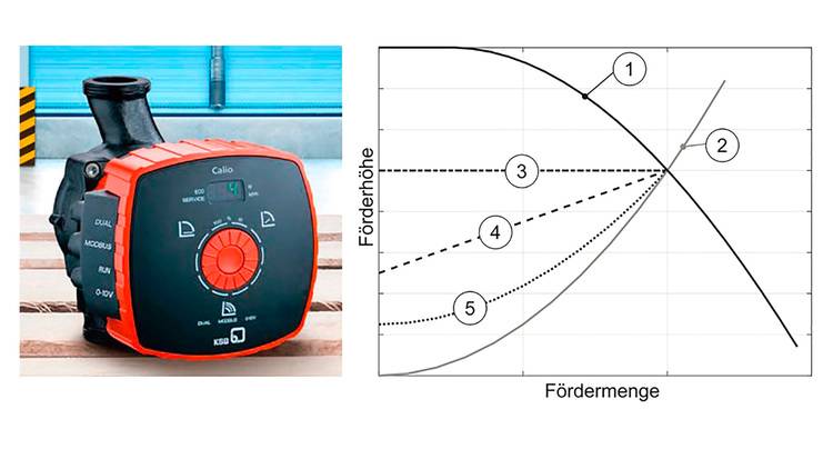 Moderne Umwälzpumpen verfügen über einen Frequenzumrichter, mit dem sich die Pumpendrehzahl in Abhängigkeit vom momentan vorliegenden Bedarf einstellen lässt. Die Einstellung erfolgt über Regelkurven. Die Pumpe kennt dafür anhand eines Schätzalgorithmus ihren aktuellen Förderstrom und ihre Förderhöhe und stellt die Drehzahl so ein, dass der Betriebspunkt sich nur entlang der jeweiligen Regelkurve verschieben kann.