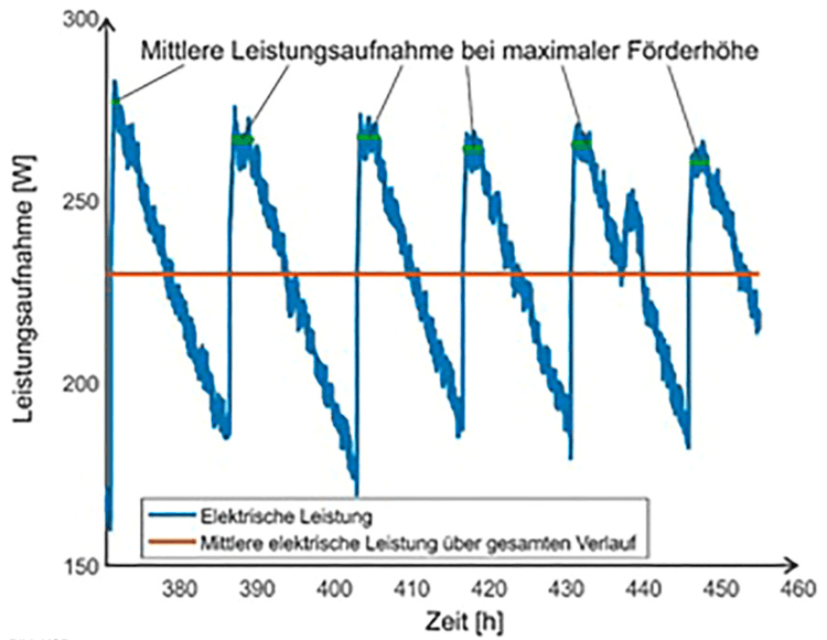 Das in (9) gezeigte Beispiel umfasst sieben Absenkzyklen. Zur Evaluierung des Energieeinsparpotenzials wird die mittlere Leistungsaufnahme bei maximaler Förderhöhe (entspricht dem Zustand ohne DynamicControl) mit der mittleren Leistungsaufnahme über den gesamten Verlauf in Relation gesetzt. (10) zeigt den Verlauf der Leistung über der Zeit und die mittlere Leistung. Daraus ergibt sich eine durchschnittliche Reduzierung der elektrischen Leistungsaufnahme der Pumpe um 21 %.