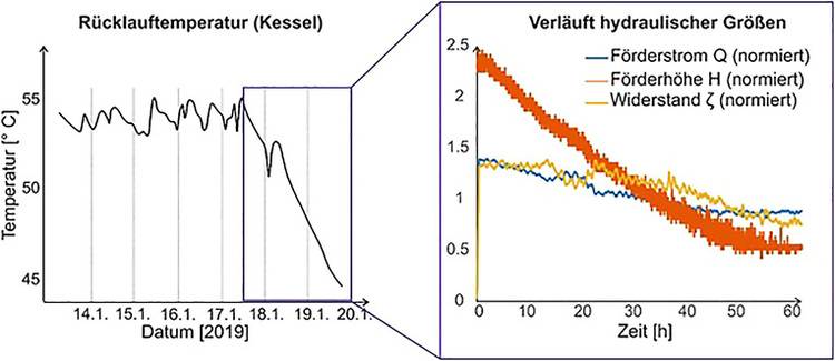 Neben dem Einsparpotenzial der Pumpe ist jedoch auch der Energieverbrauch des Kessels von Bedeutung. Um den Einfluss des Kessels zu evaluieren, wurde einmalig die Absenkung bis zur Minimaldrehzahl am Testgebäude in Rostock untersucht. Die Vorlauftemperatur wurde dabei konstant gehalten. (11) zeigt den Verlauf der Rücklauftemperatur sowie der Förderhöhe, des Förderstroms und des Anlagenwiderstands.