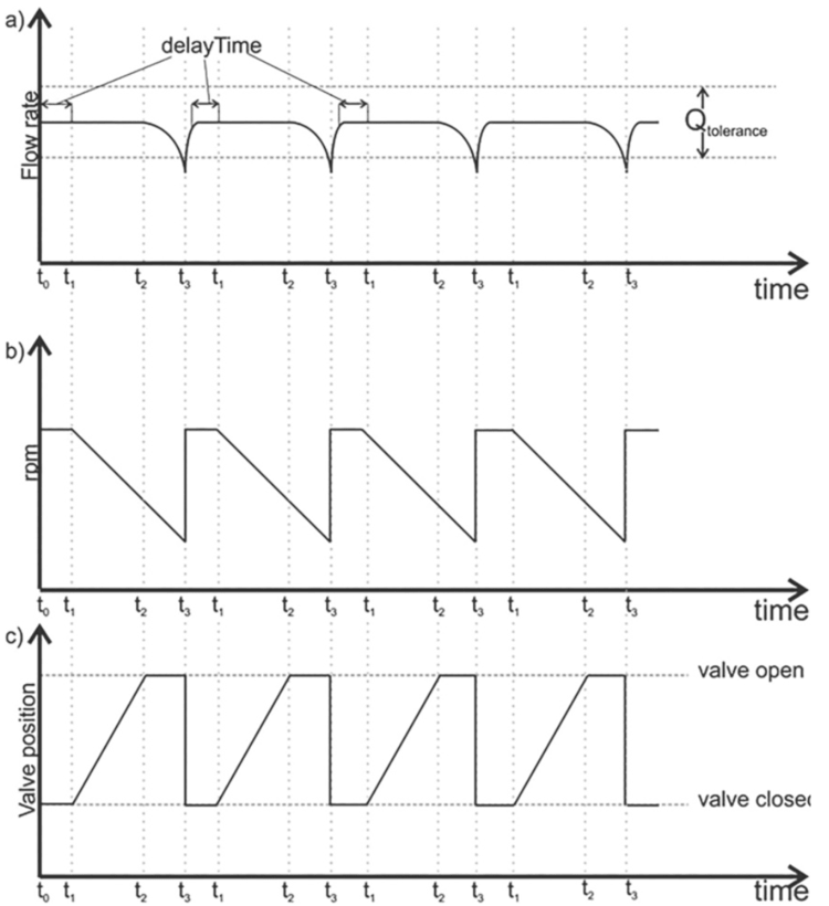 Nach dem Einschalten der Pumpe (t0) wird zunächst eine klassische statische Regelkurve eingesetzt (wie für (1) beschrieben). Gleichzeitig „beobachtet“ die Pumpe ihren Förderstrom und prüft, ob dieser innerhalb von konstanten Grenzen verbleibt. Konstant bedeutet, dass sich der Förderstrom innerhalb der Grenzen Qtolerance wie in (2) (oben) dargestellt bewegt.