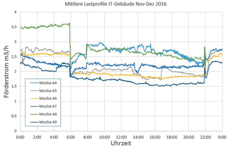 Um günstige Parameter zu finden, wurde ein Feldtest am KSB-Standort in Frankenthal an einem dreistöckigen Bürogebäude durchgeführt. Versorgt wurde das Gebäude mit einer Calio-Pumpe der 175-W-Baureihe. Dabei wurden über einen längeren Zeitraum die Förderströme und Förderhöhen aufgezeichnet. (5) zeigt den zeitlichen Verlauf der Förderströme während der Kalenderwochen 44 bis 49 des Jahres 2016.