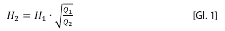 In dem angenommenen Szenario beträgt der mittlere Förderstrom Q = 2 m3/h. Die festgelegte Toleranz Qtolerance von 15 % führt dazu, dass der Förderstrom um 0,3 m3/h auf 1,7 m3/h absinken darf, ohne dass das Toleranzband Qtolerance gerissen wird. Die Förderhöhe beträgt in diesem Beispiel 7 m. Ein Absinken des Förderstroms um 0,3 m3/h würde ohne Korrektur durch die Thermostatventile zu einem Absinken der Förderhöhe auf 6,45 m führen. Dies lässt sich mit H1 = 7 m, Q1 = 2 m3/h, Q2 = 1,7 m3/h über die Affinitätsgesetze berechnen.