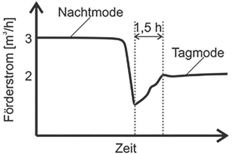 Bei der Absenkdynamik ist es relevant, dass die Drehzahl so langsam abgesenkt wird, dass die Thermostatventile schneller öffnen und somit die Raumtemperatur konstant halten. Die Dynamik der Ventile lässt sich sehr gut an der Stelle ableiten, an der der Kessel vom Nacht- in den Tagmodus schaltet. Um 06:00 Uhr morgens fährt der Kessel die Medientemperatur hoch. Gegen 07:30 Uhr erreicht der Förderstrom sein Tagniveau. Das bedeutet, die Thermostatventile benötigen etwa 1,5 h, um auf ein Ereignis zu reagieren (schematisch dargestellt (6)).