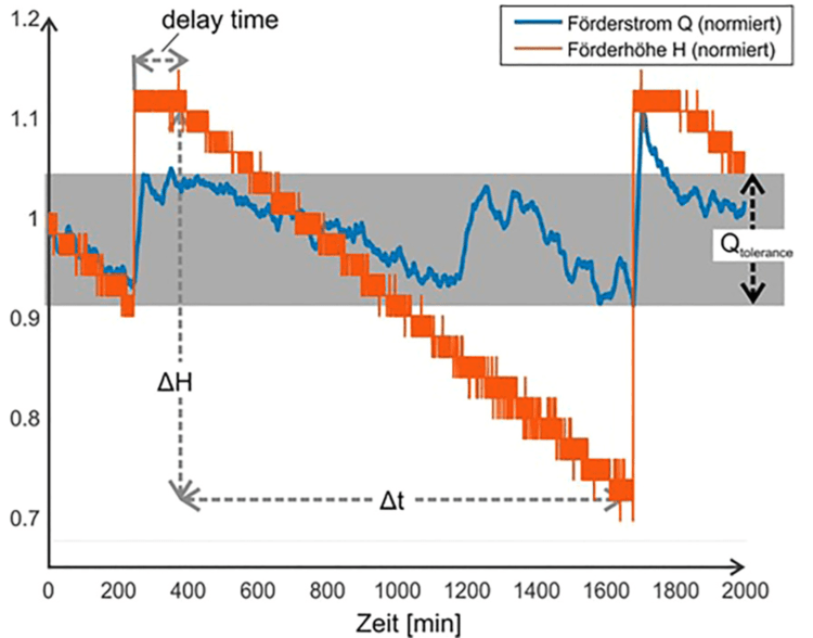 Der Zyklus beginnt mit der Wartezeit von 2 h (delayTime). Anschließend werden die Drehzahl und dadurch die Förderhöhe sehr langsam abgesenkt. Es ist erkennbar, dass der Förderstrom innerhalb der erlaubten Grenzen konstant bleibt. Sobald die Grenze gerissen wird, schaltet der Algorithmus zurück in die Ausgangssituation.