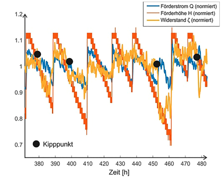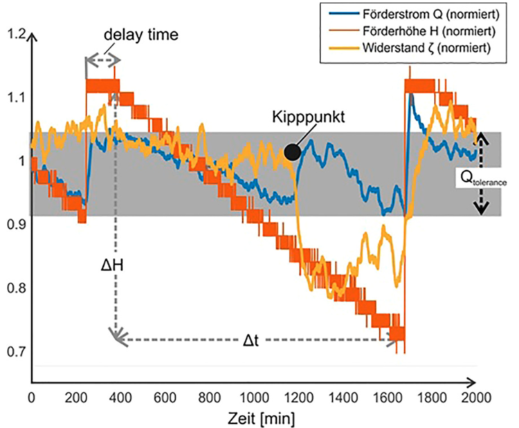 Das bedeutet, der Anlagenwiderstand sinkt nicht, wie zuvor angenommen, in Phase mit dem Absinken der Förderhöhe, sondern er reduziert sich eher zeitverzögert und sprunghaft. Da das sprunghafte Schalten innerhalb der festgelegten Grenzen Qtolerance erfolgt, ist die gewünschte Funktionalität des Algorithmus aber dennoch gegeben.