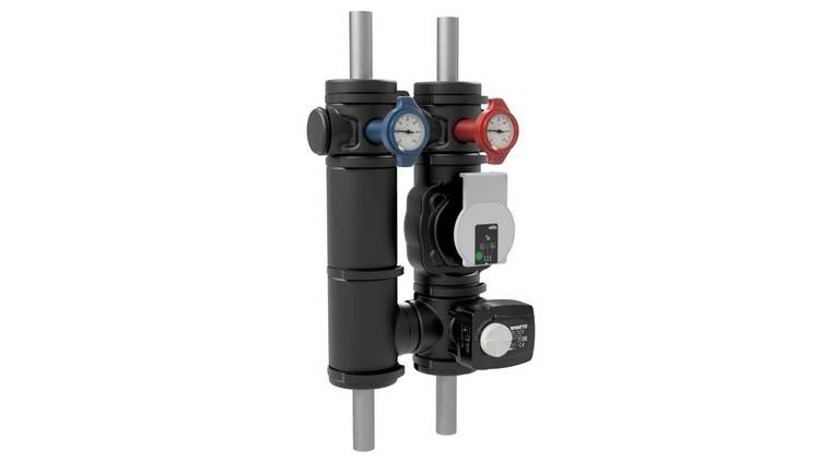 Für gemischte Heiz- und Kühlkreise ist die Pumpengruppe HKM25-C gedacht, die zusätzlich über einen 3-Wege-Mischer und Stellmotor verfügt.