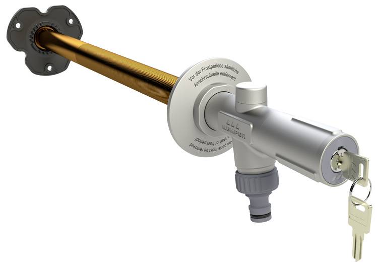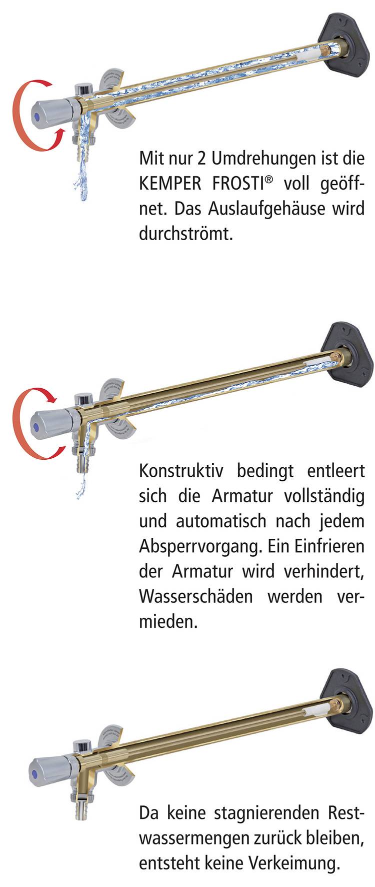 Wandert man im tiefen Winter mit einem Temperaturmessgerät durch eine Aussenwand, so stellt man fest, dass diese von außen nach innen immer wärmer wird. Und im Haus, auf der Wandoberfläche werden je nach U-Wert zwischen 15 und 19°C erreicht. Baut man also einen Zapfhahn ins Gebäude läuft die Einfriergefahr gegen Null. Und setzt man den wasserführenden Teil einer Zapfstelle ins Haus, erreicht man denselben Effekt. Daher hat man schon vor vielen Jahren einfach die wasserführenden Teile eines Zapfhahns tatsächlich nach innen verlagert und mittels einer langen Spindel von aussen bedienbar eingerichtet. Einfach und effektiv bleibt also auf diese Weise das Wasser vor dem Einfrieren und der Zapfhahn vor dem Platzen geschützt.