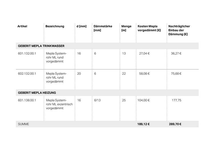 Die geringfügig höheren Materialkosten für die vorgedämmte Systemrohrvariante rechnen sich beim Einsatz schnell: Bei einer typischen Wohneinheit mit Waschtisch, Dusche, WC und Küchenzeile spart der Installateur mit dem Geberit Mepla Systemrohr vorgedämmt im Vergleich zum ungedämmten Rohr und nachträglicher Dämmung einen zusätzlichen Arbeitsschritt oder umgerechnet bis zu 100 Euro (siehe Tabelle 1).