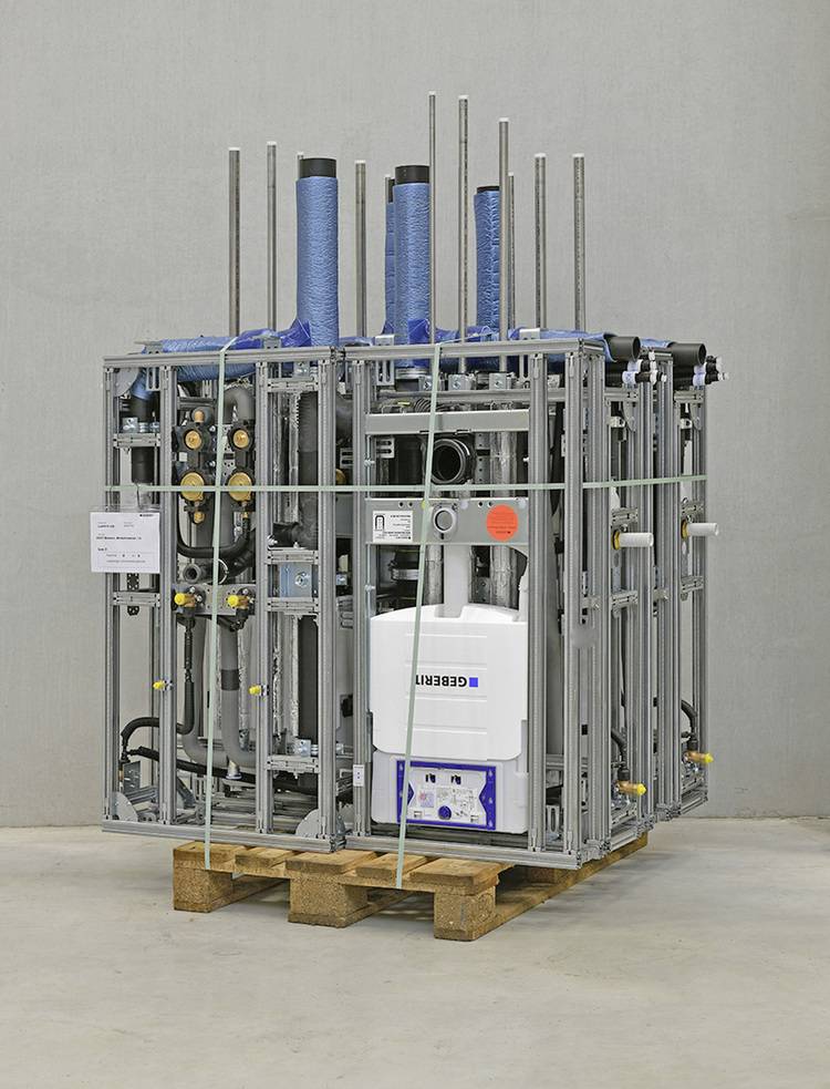 Somit trägt diese Technik nicht nur zu einer einfachen Montage, sondern auch zu einem schnellen Baufortschritt bei. Zudem bietet sie genügend Flexibilität, um Anpassungen an die Bausituation in der Höhe und Anordnung der Sanitärausstattungsgegenstände vor Ort vorzunehmen. Ein großes Plus ist die kurze Lieferzeit von nur fünf bis zehn Werktagen. Nach der Montage in der Trockenbauwand werden die Ausschubmodule an die Verrohrung angeschlossen.