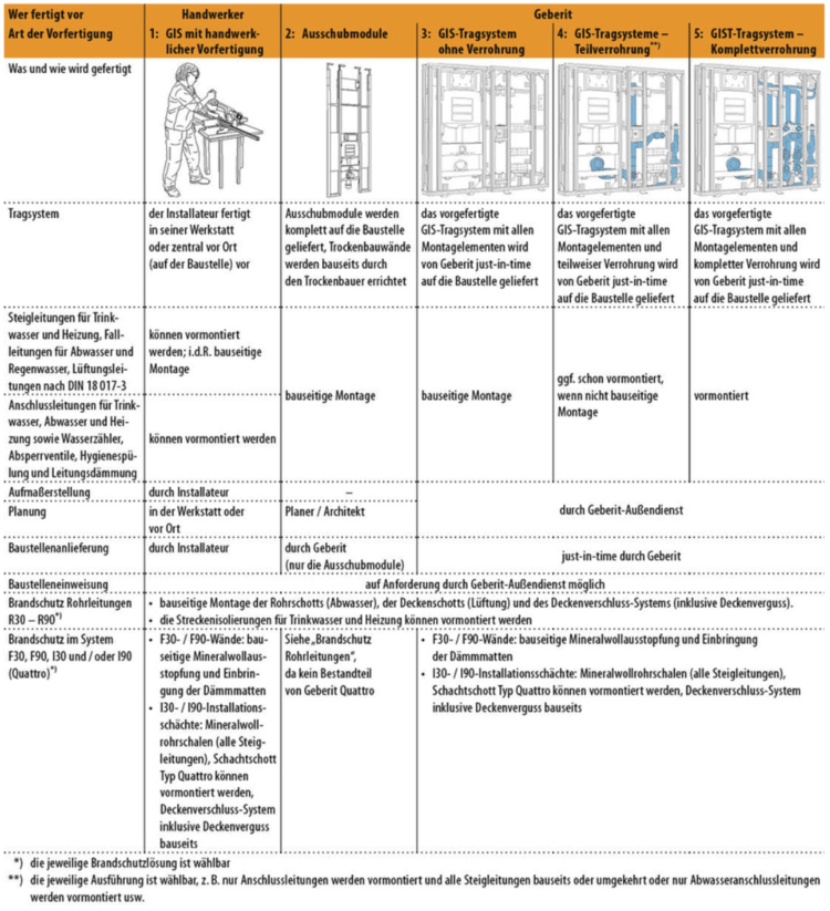 Die Variante 5 ist als komplett industriell vorgefertigtes System (4) die Lösung für größere Bauprojekte, zum Beispiel im Geschosswohnungsbau, für Krankenhäuser, für Hochhäuser und Hotels. Also dort, wo Einzellösungen nicht mehr wirtschaftlich sind, spielt GIS als komplett vorgefertigte Installationswand seine Vorteile aus.