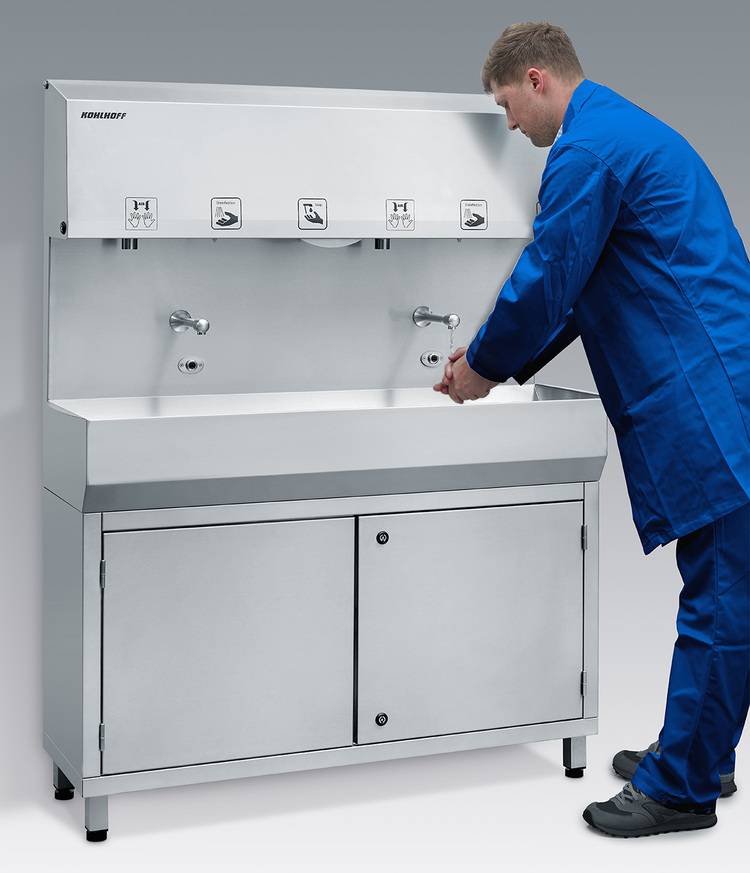 Für eine Vielzahl hygienetechnischer Anforderungen entwickelt Kohlhoff aus Unna seit mehr als 30 Jahren Lösungen. Dazu gehören auch die neuen platzsparenden, komplett aus Edelstahl gefertigten, vandalismussicheren (robusten) Hand-Hygienecenter.