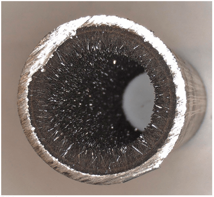Dem Korrosionsmodell von (1) entsprechend kann eine höhere Sauerstoffkonzentration auch mehr elektrische Ladung (e–) übernehmen, die von den austretenden positiven Eisenionen beim Übertritt ins Heizungswasser am Metall zurückgelassen werden. Diese Depolarisation stellt eine Voraussetzung für den ungehinderten Auflösungsvorgang des metallenen Festkörpers dar. Letztlich führt dies zu einem Versagen des Bauteils oder zumindest zu einer übermäßigen Bildung von Magnetit (3). Fehlt der Sauerstoff, kommt dieser Korrosionsprozess zum Stillstand.