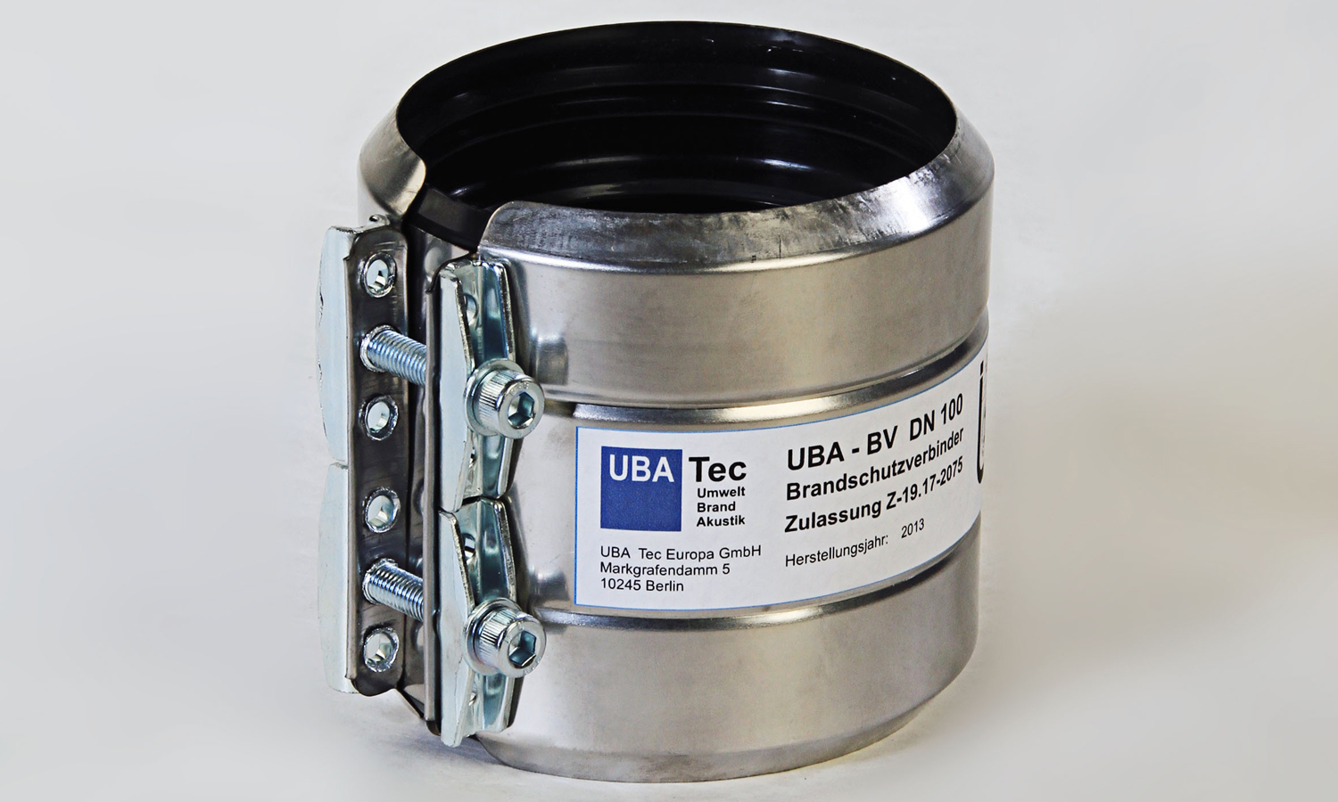 Eine einfache und leicht zu realisierende Lösung für die Erfüllung dieser Vorgaben stellt der UBA-BV Brandschutzverbinder der UBA Tec dar. Er ist, ergänzend zum bewährten UBA-Flex, als Rohrverbinder geprüft und zugelassen. Er erfüllt alle geltenden Vorschriften an die Abschottung von Gussrohren (R90) und ist für Rohrleitungssysteme aus Guss von DN 50 - DN 125 erhältlich. Als Verwendbarkeitsnachweis dafür wurde dem UBA-BV Brandschutzverbinder die abZ-Nummer Z-19.17-2075 (nach DIN 4102-11) erteilt.