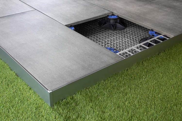 Frost- und Wasserschäden an keramischen Belägen beugt auch das Stelzlagersystem Flexibal vor. Die Stützen sind jeweils mit bis zu 400 Kilogramm belastbar und eignen sich für Unterkonstruktionen von 25 bis 185 Millimetern. Unebene Bodenverhältnisse – auch punktuell – gleichen sie problemlos aus. Die selbstnivellierende Variante bietet dabei bis zu fünf Prozent Neigungsausgleich.